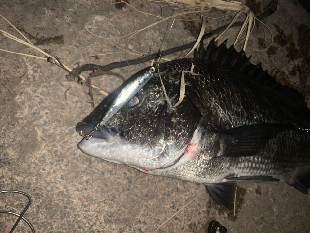 バーン!予想通り釣れました。目測51cmのチヌ。アジ用タックルなので存分に引きを楽しみつつ、慎重にいなしてキャッチ。