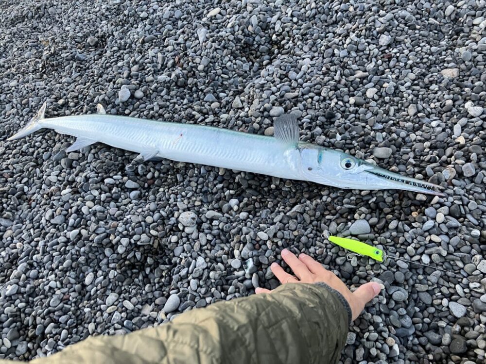 ちなみに早朝に青物を狙ってみるも、海は荒れておりどう考えてもヒラが居る!と思い、狙ってみるとまさかの巨ダツ。ランカーヒラいったな…と思ったら魚種違いで120cmぐらいあった。